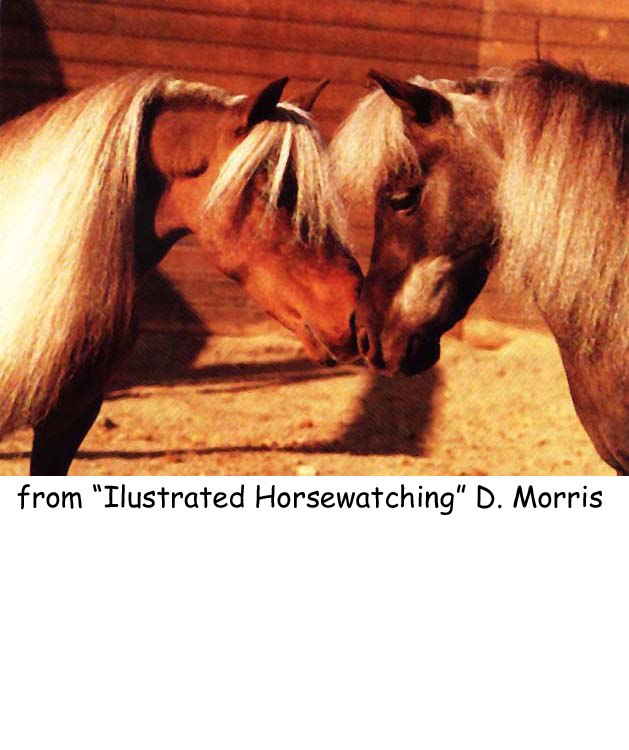 This a a greeting according to good horse-etiquette – friendly ears and eyes and a prolonged sniffing to remember the other’s identity.
