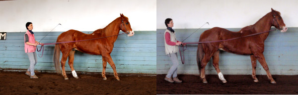 Versuchen Sie flüssige Übergänge vom Schritt oder Trab direkt ins Rückwärtsrichten ohne Stopp. Die Fußfolge sollte rückwärts diagonal sein.
