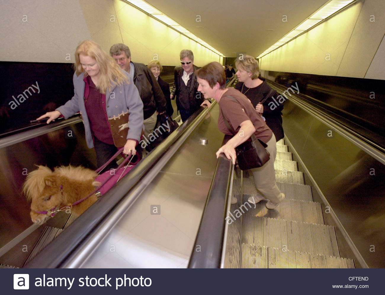 Jan 10, 2007; Atlanta, GA, USA; A traveller gawks at guide horse CUDDLES being led by trainer JANET DONALD at Hartsfield Atlanta International Airport. Cuddles, a 2-year-old minature horse is 24 inches tall and weighs 55 lbs. She wears sneakers to protect her hooves and the rubber soles give her traction. Cuddles avoids puddles and low overhangs, she chooses ramps and elevators over stairs, and she only needs to walk a route once or twice before committing it to memory. She has been taught to overrule Shaw’s commands when obeying him would place them in danger. She is house broken, neighing and crossing her legs when she needs to go outside. Mandatory Credit: Photo by Erik Lesser/ZUMA Press. (©) Copyright 2007 by Erik Lesser