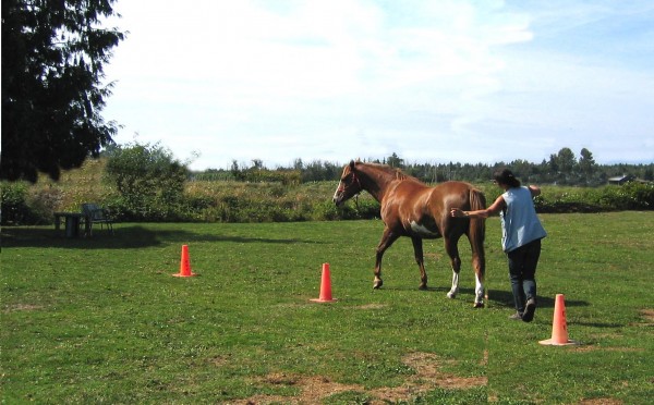 Lean out sideways slightly so the horse can see you